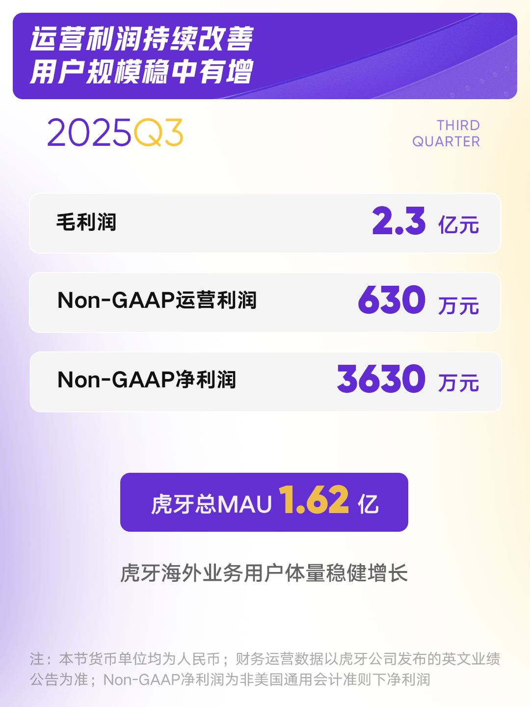 NBA直播,足球直播,篮球直播,欧洲杯直播,lol直播,英雄联盟直播,dota2直播,dnf直播,cf直播,绝地求生直播,王者荣耀直播,游戏直播,赛事直播,YY直播,美女直播,视频直播,足球直播虎牙公司(NYSE:HUYA)于北京时间2025年11月12日下午(美国东部时间2025年11月12日早晨)公布了2025年第三季度财报。财报显示,该季度,虎牙公司总收入达16.9亿元,创近九个季度以来新高,同比增速提升至约10%。其中,直播收入企稳回升,达11.6亿元;游戏相关服务、广告和其他业务保持快速增长,该板块收入同比上涨约30%至5.3亿元,占总收入比例提高至31.5%。在非美国通用会计准则(Non-GAAP)下,该季度公司实现运营利润630万元,归属于虎牙公司的净利润3630万元。用户数据方面,2025年第三季度,虎牙总MAU达到1.62亿。