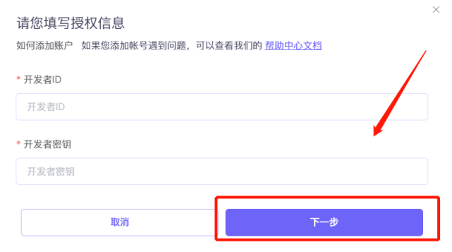 4.将【appId(开发者ID)】和【appSecret(开发者密钥)】两个参数复制,粘贴到集简云授权账户中,点击“下一步”即可授权成功
