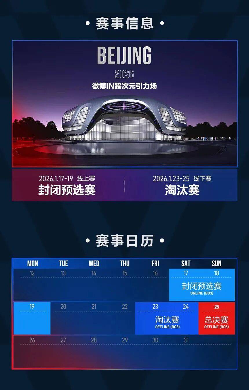 赛事赛程已正式敲定,1月17日至19日将率先开启线支战队通过单败淘汰制争夺8个线日,晋级战队将齐聚北京微博IN跨次元引力场展开线下巅峰对决。
