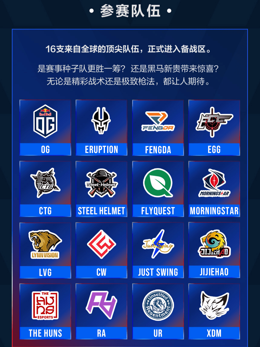 本次赛事阵容强大,已吸引来自中国、欧洲、亚太等多个地区的16支顶尖战队参赛,其中包括欧洲老牌劲旅OG、澳洲强队FlyQuest,以及国内知名战队LVG、RA等。