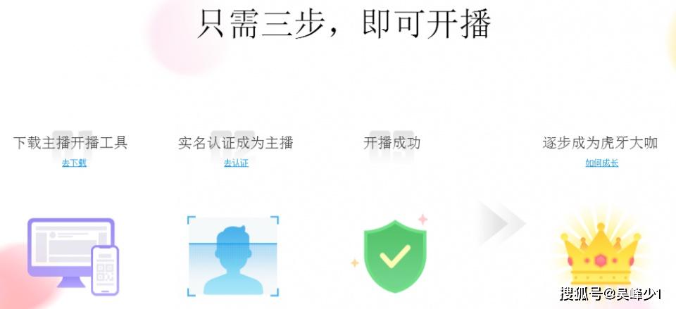 成为虎牙主播来开直播只需要三步:下载主播开播工具》实名认证成为主播》开播成功,过程很简易单我就不多说了。