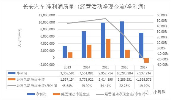 长安汽车的净利润质量可谓六亲不认不留情面,2016年就开始大幅下跌不说,竟然在2017年跌破0点至-19%,让人不得不诧异净利润质量和营收质量之间的巨大沟壑究竟来自何处。