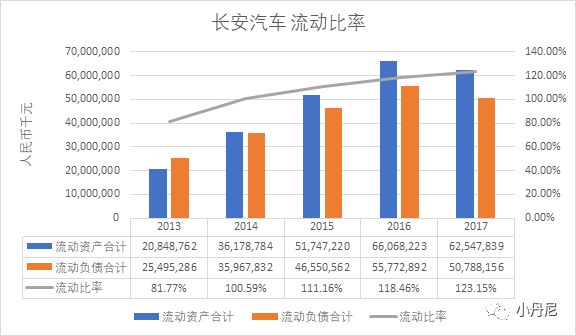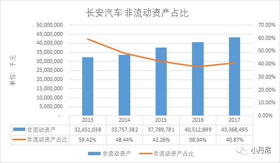 不仅周转率有所提升,长安汽车的资产流动性也在逐渐上升:2013年到2017年,长安汽车的非流动资产占比整体下降。