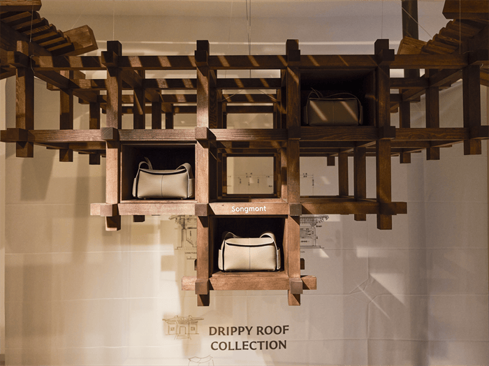 屋檐系列造型灵感来源于山西古建南禅寺,它是现存中国最古老的木结构古建筑。山下有松从中提炼设计了更具现代简洁感的屋檐包造型,瓦砾灰、青石绿等色彩亦透露出古建的时光感。屋檐灵感装置将中国古建筑中屋檐的形态与美感以木结构的表达呈现出来,在浓郁的东方建筑气韵里,就像回到了熟悉的过往。