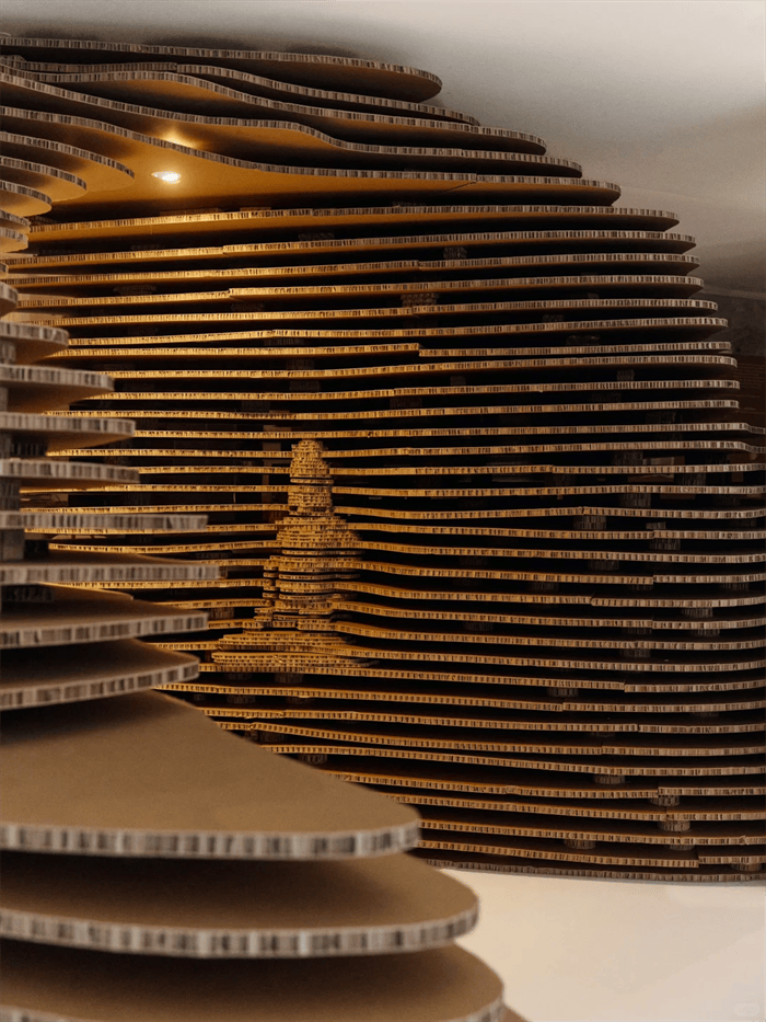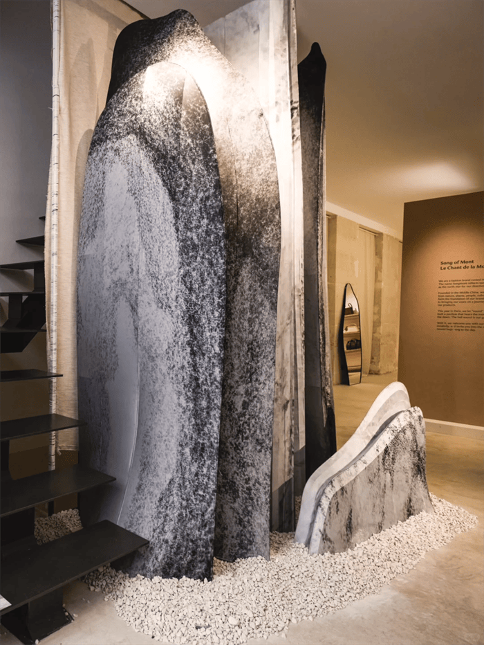 本次展览空间主视觉为一座贯穿展厅两层楼的山石装置,在巴黎建一座东方山阁,重现宋朝画作《溪山行旅》中的场景。山下有松邀请非遗手工艺人制作,以中国山水画技法(雨点皴cūn)还原山体纹理。伴随空间中萦绕的钟磬声,观展的人们仿佛走进了水墨画中,行山而上,颇有“万籁此俱寂,但余钟磬声”的意境。