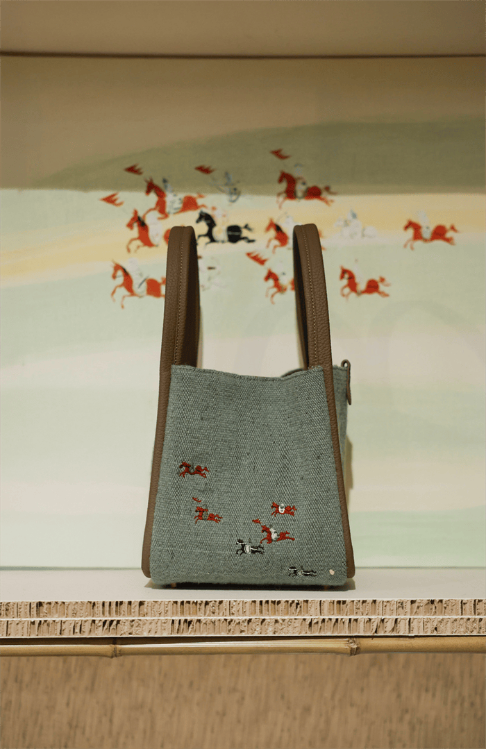 同时,山下有松长期关注地域文化与手工技艺,探索艺术共创等形式来推动在地手工艺可持续发展,为手艺人创造更稳定的收入渠道。近期,山下有松探寻甘孜氆氇手工艺线路,邀请中国当代艺术家武艺从在地文化中汲取灵感,创作专属纹样,由手工匠人制作还原纹样,融入菜篮子包设计焕新,在本次展览首次亮相。