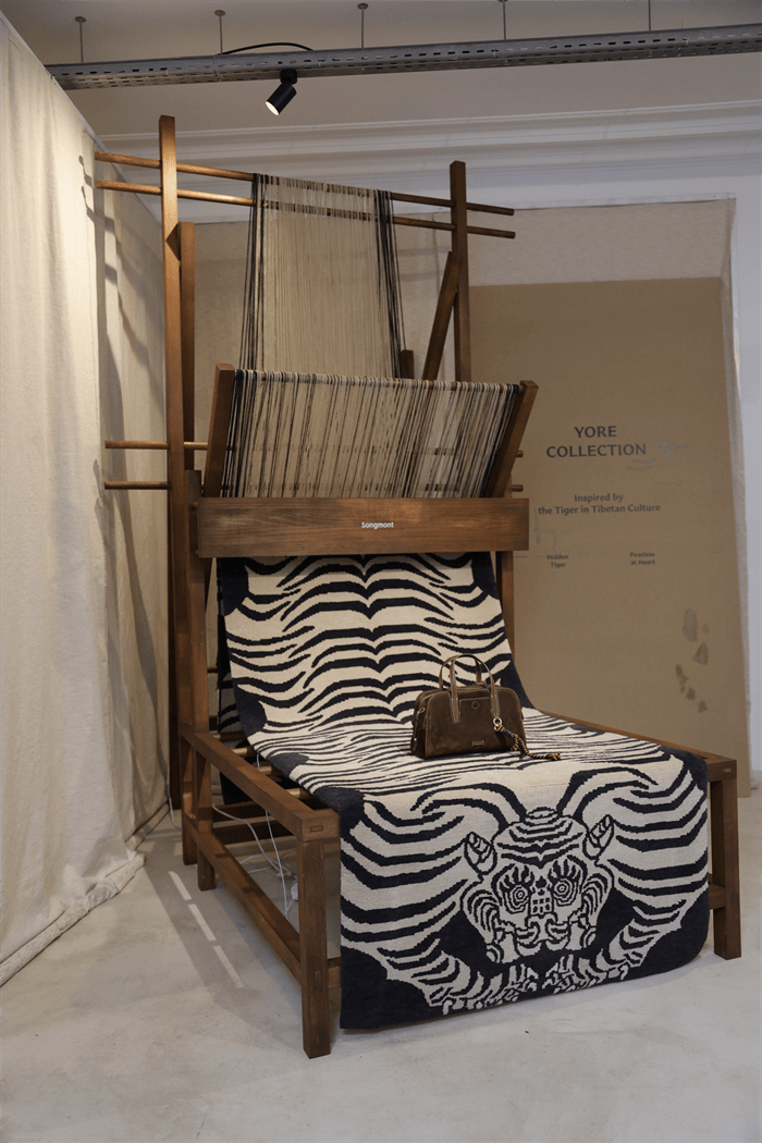 循迹系列是山下有松行至甘南后的在地探寻成果,以古老编织中的“虎”为灵感,抽象提炼,应用于产品包体与内里中。展区内一台来自中国藏区的织布机,搭载着由甘孜非遗手工团队编织而成的虎毯与乌朵挂件,呈现藏地文化中与“虎”相关的意象。